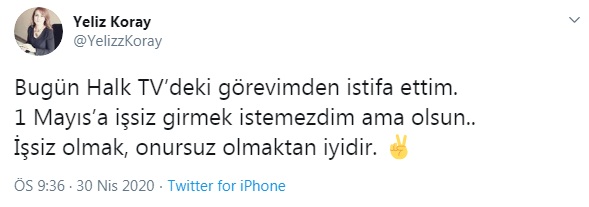 Koray, Halk TV'deki çatlağı, "Bugün Halk TV’deki görevimden istifa ettim. 1 Mayıs’a işsiz girmek istemezdim ama olsun.. İşsiz olmak, onursuz olmaktan iyidir." ifadeleriyle duyurdu.