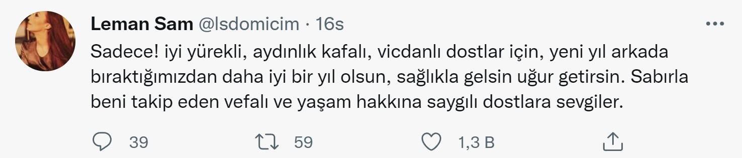 Sosyal medya hesabından yeni yıl paylaşımında bulunan ‘Aydın ve çağdaş maskeli’ Leman Sam, kendilerinden olmayan insanları ötekileştirmeye kalktı. Mesajında ‘Sadece aydınlık kafalılar’ diyerek sadece bir kesimin yeni yılını kutlayan Sam, yıllar önce "Benim oyum ile dağdaki çobanın oyu bir mi?" diyen ve halka tepeden bakan Aysun Kayacı'yı akıllara getirdi.