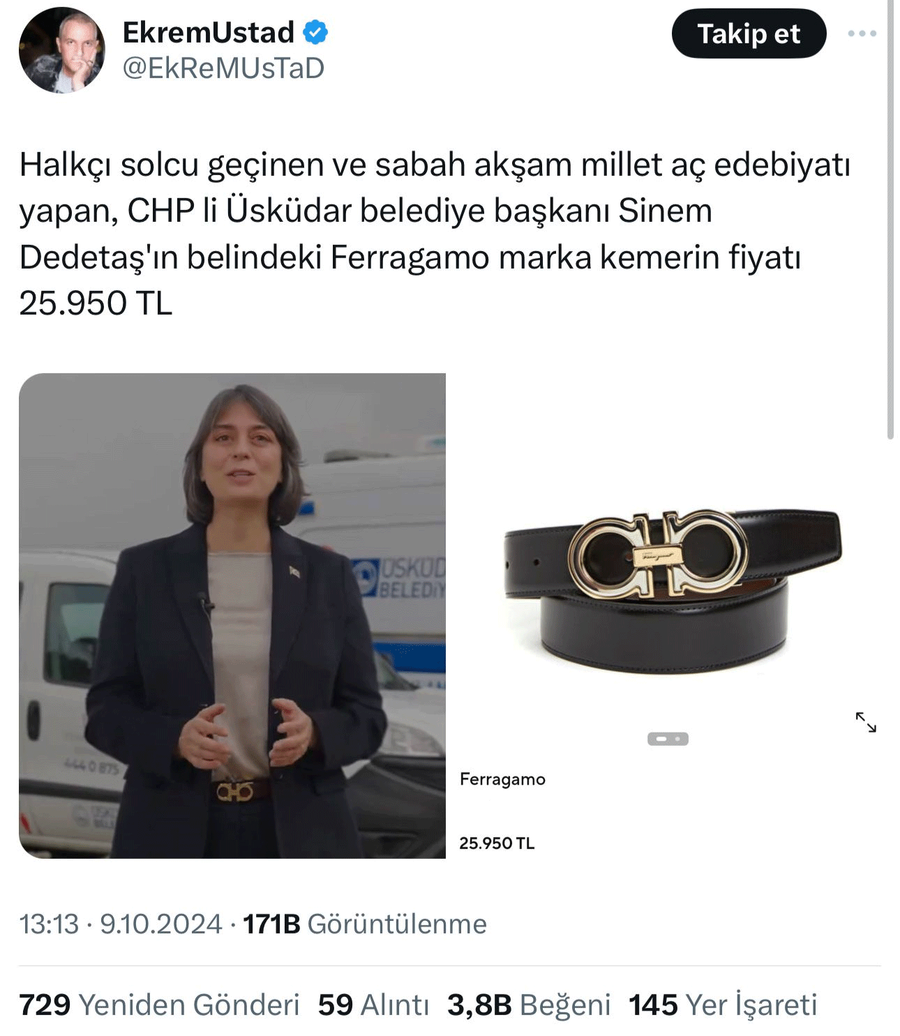 Halkçı söylemlerle sahneye çıkan CHP’li Üsküdar Belediye Başkanı Sinem Dedetaş, giyimiyle tepki topladı. Sabah akşam "millet aç" edebiyatı yapan Dedetaş’ın belindeki 25.950 TL değerindeki Ferragamo marka kemer, sosyal medyada infiale yol açtı.