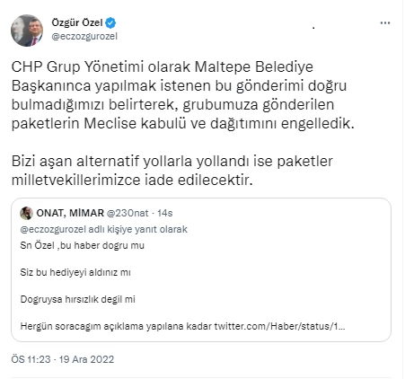 CHP Grup Başkanvekili Özgür Özel, sosyal medya hesabından yaptığı paylaşımda, “CHP Grup Yönetimi olarak Maltepe Belediye Başkanınca yapılmak istenen bu gönderimi doğru bulmadığımızı belirterek, grubumuza gönderilen paketlerin Meclis’e kabulü ve dağıtımını engelledik. Bizi aşan alternatif yollarla yollandı ise paketler milletvekillerimizce iade edilecektir.” dedi.