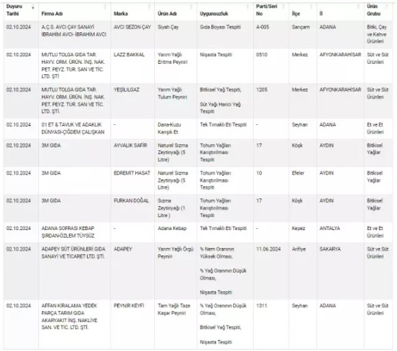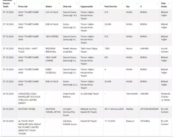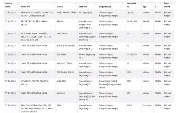 Tarım Bakanlığı, tohum yağı veya düşük kaliteli yağları saf zeytinyağı olarak satan firmaların isimlerini ifşa etti. Hileli ürün satışı yapan bu firmalar, halk sağlığını hiçe sayarak faaliyet gösterdi.