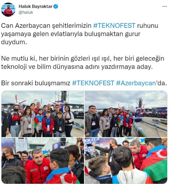 Türkiye'nin en büyük teknoloji etkinliği TEKNOFEST İstanbul Havacılık, Uzay ve Teknoloji Festivali Atatürk Havalimanı'nda ikinci gününde de devam ederken Baykar Genel Müdürü Haluk Bayraktar Azerbaycan şehitlerimizin evlatlarıyla bir araya geldi. Bayraktar sosyal medya hesabından yaptığı paylaşımda, “Can Azerbaycan şehitlerimizin #TEKNOFEST ruhunu yaşamaya gelen evlatlarıyla buluşmaktan gurur duydum. Ne mutlu ki, her birinin gözleri ışıl ışıl, her biri geleceğin teknoloji ve bilim dünyasına adını yazdırmaya aday. Bir sonraki buluşmamız #TEKNOFEST #Azerbaycan'da” ifadelerini kullandı.
