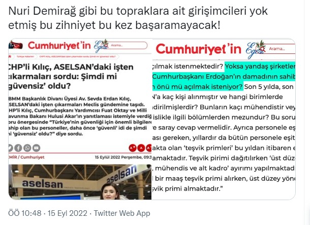 Baykar Teknoloji CEO'su Haluk Bayraktar, sosyal medya hesabından, Cumhuriyet Gazetesi’nin fitne ve iftira yayınlarını içeren kupürleri kullanarak yaptığı paylaşımda, “Öz kaynaklarınla sıfırdan geliştirdiğin teknolojilerle dünyanın gıpta ile baktığı bir firma ol, memleketin ana muhalefet partisi sinsice iftira ve algı oyunlarıyla yoluna TAKOZ koysun. Nuri Demirağ gibi bu topraklara ait girişimcileri yok etmiş bu zihniyet bu kez başaramayacak!” diye yazdı.