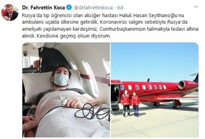 Koronavirüsle mücadelede Türkiye sınır tanımıyor. Sağlık Bakanlığı, Rusya'da bir hastanede akciğerlerinde hava birikmesi sonucu tedavi altında bulunan 24 yaşındaki Haluk Hasan Seyithanoğlu'nu ambulans uçakla Türkiye'ye getirdi. İsveç’te Covid-19 teşhisi konulmasına rağmen eve gönderilen kronik kalp hastası Emrullah Gülüşken için seferber olunmuştu.