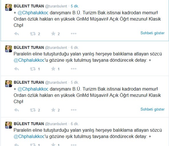 Ak Parti İstanbul Millletvekili Bülent Turan da Koç'un paralel yapı tarafından eline tutuşturulan listeyle hareket ettiğini açıklayarak danışmanına ilişkin de şu tivitleri paylaştı: