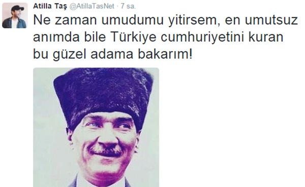 YENİAKİT.COM.TR - Çapulcu Atilla Taş, AK Parti'nin tek başına iktidar olmasının ardından Twitter'dan itirafta bulundu. 'En umutsuz anında' umut depolamaya çalışan Taş, "Ne zaman umudumu yitirsem, en umutsuz anımda bile Türkiye cumhuriyetini kuran bu güzel adama bakarım!" ifadelerini kullanarak Mustafa Kemal'in fotoğrafını paylaştı.