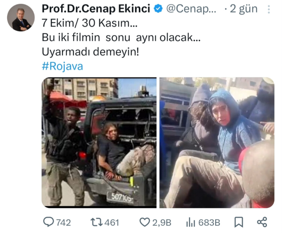 Sosyal medyadan bir paylaşım yapmış: “7 Ekim/30 Kasım… Bu iki filmin sonu aynı olacak… Uyarmadı demeyin! Rojava” Görsel olarak da iki fotoğraf..' ifadelerine yer verdi.