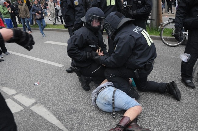 Hamburg'un St. Pauli ilçesindeki Feldstrasse metro durağı önünde akşam saatlerinde toplanan yaklaşık 3 bin kişi, Rote Flora Kültür Merkezi'ne doğru yürüyüşe geçti. Budapester Caddesi'nde göstericiler arasındaki bazı grupların, güvenlik güçlerine taş, şişe ve torpil atması üzerine polis müdahale etti. Burada göstericiler arasındaki bazı kişiler gözaltına alındı.