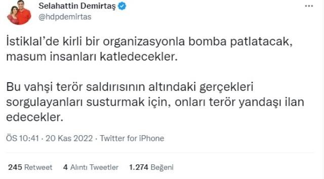 İstiklal Caddesi’nde bomba bırakarak sivillerin ölümüne sebep olan PKK/PYD’ye tek laf etme, teröristi koru; sonra barış elçisi rolüne bürün. Azmettiricisi olduğun 6-8 Ekim’i unutmadık. Vicdanında bir sızı olmasını beklerdik ama o duygu size hiç uğramamış."