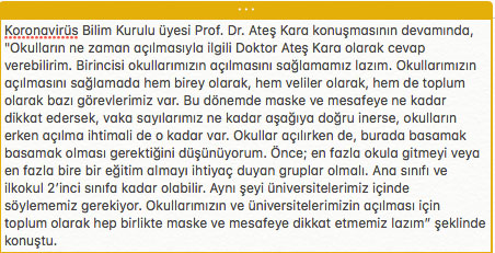 Koronavirüs Bilim Kurulu üyesi Prof. Dr. Ateş Kara konuşmasının devamında, "Okulların ne zaman açılmasıyla ilgili Doktor Ateş Kara olarak cevap verebilirim. Birincisi okullarımızın açılmasını sağlamamız lazım. Okullarımızın açılmasını sağlamada hem birey olarak, hem veliler olarak, hem de toplum olarak bazı görevlerimiz var. Bu dönemde maske ve mesafeye ne kadar dikkat edersek, vaka sayılarımız ne kadar aşağıya doğru inerse, okulların erken açılma ihtimali de o kadar var. Okullar açılırken de, burada basamak basamak olması gerektiğini düşünüyorum. Önce; en fazla okula gitmeyi veya en fazla bire bir eğitim almayı ihtiyaç duyan gruplar olmalı. Ana sınıfı ve ilkokul 2’inci sınıfa kadar olabilir. Aynı şeyi üniversitelerimiz içinde söylememiz gerekiyor. Okullarımızın ve üniversitelerimizin açılması için toplum olarak hep birlikte maske ve mesafeye dikkat etmemiz lazım” şeklinde konuştu