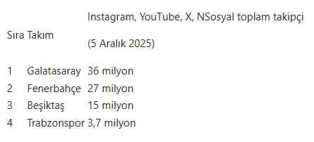 Instagram'da 11,5 milyon, X'te 12,4 milyon ve YouTube'ta 3 milyon ve NSosyal'de 23 bin ile dört platformda toplamda 27 milyon takipçiye sahip Fenerbahçe ise ikinci sırada bulunuyor.