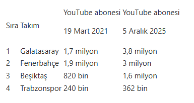 Geçen yaklaşık 5 yıl içinde Galatasaray'ın YouTube'taki abone sayısı 1,7 milyondan 3,8 milyona ulaşırken, Fenerbahçe ise 1,9 milyondan 3 milyona çıktı. Beşiktaş'ın YouTube'ta abone sayısı ise 820 binden 1,6 milyona yükselirken, Trabzonspor'un abone sayısı ise 240 binden 362 bine çıktı.