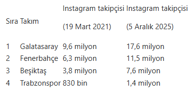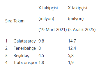 Söz konusu süreçte Galatasaray, takipçi sayısını 9,6 milyondan 17,6 milyona, Fenerbahçe 6,3 milyondan 11,5 milyona, Beşiktaş 3,8 milyondan 7,6 milyona, Trabzonspor ise 830 binden 1,4 milyona yükseltti.