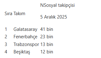 Instagram'da 1,4 milyon, X'te 1,9 milyon, YouTube'ta 362 bin ve NSosyal'de 13 bin takipçisi bulunan Trabzonspor da 3 milyon 675 binle sıralamada yer aldı.