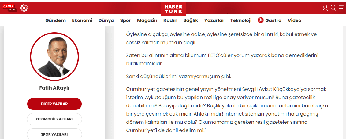 "Cumhuriyet gazetesinin genel yayın yönetmeni Sevgili Aykut Küçükkaya’ya sormak isterim, Aykutcuğum bu yapılan rezilliğe onay veriyor musun? Buna gazetecilik denebilir mi? Bu ayıp değil midir? Başlık yolu ile bir açıklamanın anlamını bambaşka bir yere çevirmek etik midir. Ahlaki midir! İnternet sitenizin yönetimi hala geçmiş dönem kalıntıları ile mu dolu? Okumamamız gereken rezil gazeteler sınıfına Cumhuriyet’i de dahil edelim mi!"