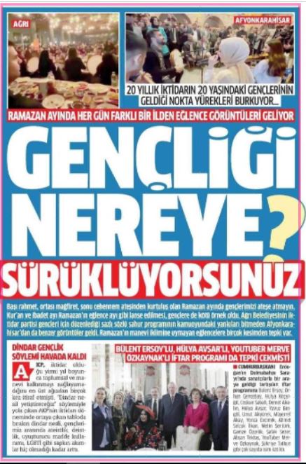 Saadet’in Milli Gazete’si “Gençliği nereye sürüklüyorsunuz?” başlığıyla bir habere yer verdi. Haberde, “20 yıllık iktidarın 20 yaşındaki gençlerinin geldiği nokta yürekleri burkuyor... Ramazan ayında her gün farklı bir ilden eğlence görüntüleri geliyor. AKP, iktidar olduğu yirmi yıl boyunca toplumsal ve manevi kalkınmayı sağlayamadığını en üst ağızdan birçok kez itiraf etmişti. “Dindar nesil yetiştireceğiz” söylemiyle yola çıkan AKP’nin iktidarı döneminde ortaya çıkan tabloda bırakın dindar nesli, gençlerimiz arasında ateistlik, deistlik, uyuşturucu madde kullanımı, LGBTİ gibi sapkın akımlar hiç olmadığı kadar arttı.” ifadelerine yer verdi. Ancak Milli Gazete'nin eleştiri yaptığı görüntülerde LGBTİ ile uzaktan yakından ilgisi olmayan, sahur programı fotoğrafı ile tef müziği yer aldı..