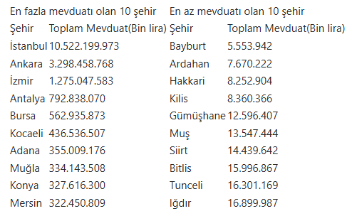 En fazla mevduata sahip il 10 trilyon 522 milyar 200 milyon lirayla İstanbul oldu. Bu ili 3 trilyon 298 milyar 458 milyon 768 bin lirayla Ankara ve 1 trilyon 275 milyar 47 milyon 583 bin lirayla İzmir takip etti.