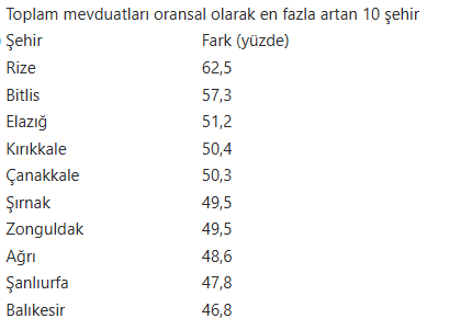 Bankalardaki mevduatlarda en az oransal artış ise yüzde 15,1 ile Kahramanmaraş'ta gerçekleşti. Geçen yılın 3. çeyreğinde 82 milyar 885 milyon 342 bin lira olan mevduat, bu yılın aynı döneminde 95 milyar 408 milyon 535 bin liraya çıktı. Kahramanmaraş'ın ardından oransal olarak mevduatı en az artan iller, yüzde 17,8 ile Kastamonu, yüzde 22,8 ile Hakkari oldu.