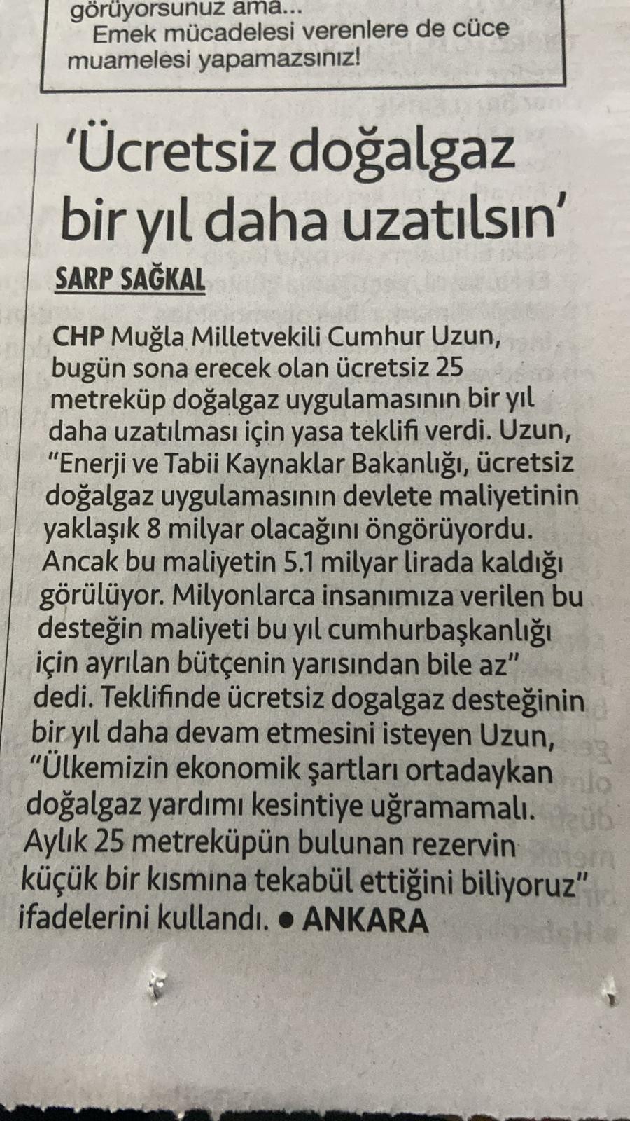 CHP Muğla Milletvekili Cumhur Uzun, bugün sona erecek olan ücretsiz 25 metreküp doğal gaz uygulamasının bir yıl daha uzatılması için yasa teklifi verdi. Uzun, “Enerji ve Tabii Kaynaklar Bakanlığı, ücretsiz doğal gaz uygulamasının devlete maliyetinin yaklaşık 8 milyar olacağını öngörüyordu. Ancak bu maliyetin 5.1 milyar lirada kaldığı görülüyor. Milyonlarca insanımıza verilen bu desteğin maliyeti bu yıl cumhurbaşkanlığı için ayrılan bütçenin yarısından bile az” dedi. Teklifinde ücretsiz doğal gaz desteğinin bir yıl daha devam etmesini isteyen Uzun, “Ülkemizin ekonomik şartları ortadayken doğal gaz yardımı kesintiye uğramamalı. Aylık 25 metreküpün bulunan rezervin küçük bir kısmına tekabül ettiğini biliyoruz” ifadelerini kullandı.