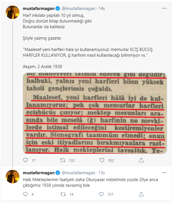 Konuyla ilgili Twitter hesabından açıklamalarda bulunan Tarihçi yazar Mustafa Armağan, "Harf inkılabı yapılalı 10 yıl olmuş, Doğru dürüst kitap bulunmadığı gibi Bulunanlar da kalitesiz." dedi.