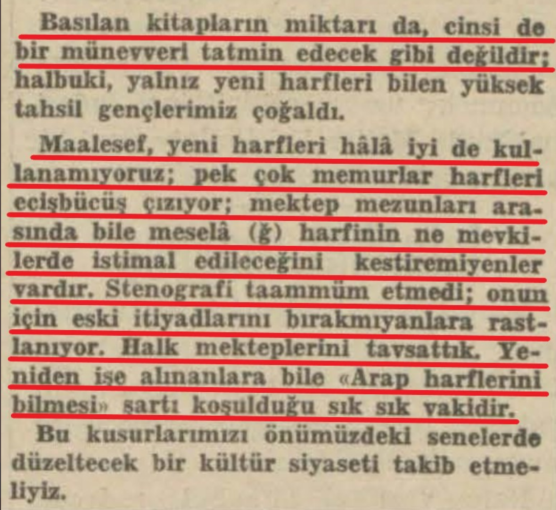 "Maalesef yeni harfleri hala iyi kullanamıyoruz: memurlar ECİŞ BÜCÜŞ HARFLER KULLANIYOR, ğ harfinin nasıl kullanılacağı bilinmiyor vs." Akşam, 2 Aralık 1938" dedi.
