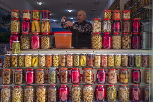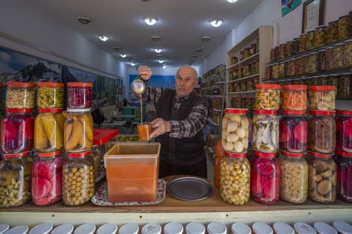 Bir zamanlar el arabasıyla sokak sokak dolaşarak turşu ve kete satan Bayram usta, kendisini 45 yıl öncesinden tanıyan müşterilerini dükkanında ağırlıyor.