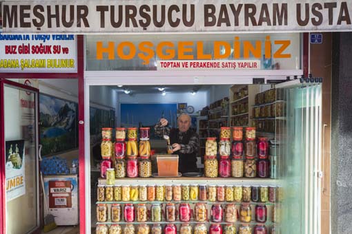 Kentte yaşayanların bildiği "turşu-kete" lezzetini yıllardır yaşatan 67 yaşındaki turşucu Bayram ustanın dükkanında balıktan yumurtaya, muzdan kiviye, patlıcandan kozalağa kadar 85 çeşit turşu bulunuyor.