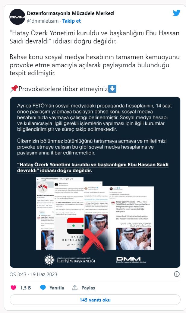 Dezenformasyonla Mücadele Merkezi, sosyal medya hesaplarından paylaşılan "Hatay Özerk Yönetimi kuruldu ve başkanlığını Ebu Hassan Saidi devraldı" iddiaları hakkında açıklamaa bulundu.