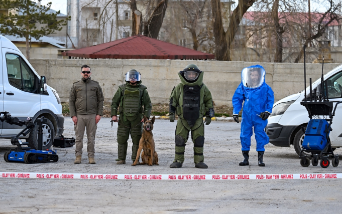 Van'da tam teçhizatlı bomba müdahale ekip aracıyla göreve gidip son teknolojik imkanlardan yararlanan ekipler, patlayıcı tespitinde bomba arama köpeği ve bomba imha robotlarını da aktif olarak kullanıyor.