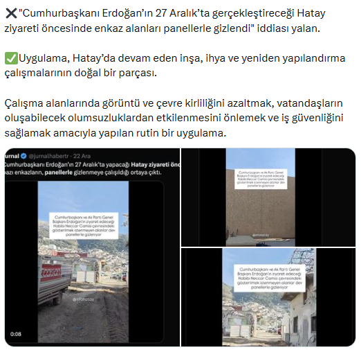"Cumhurbaşkanı Erdoğan’ın 27 Aralık’ta gerçekleştireceği Hatay ziyareti öncesinde enkaz alanları panellerle gizlendi" iddiası yalan.