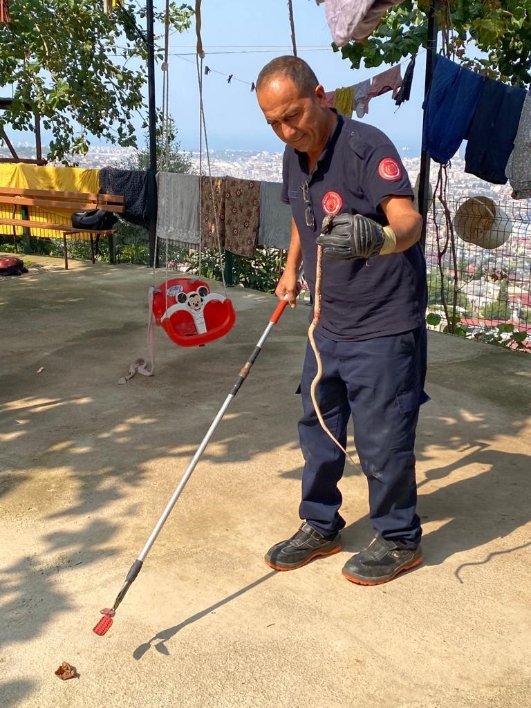 Edinilen bilgiye göre, İskenderun ilçesine bağlı Gültepe Mahallesi’nde bir eve yılan girdi. Mahalle sakinleri itfaiye ekiplerini aradı. Olay yerine gelen itfaiye ekiplerinin özverili çalışmasıyla yılan evden çıkartıldı. İtfaiye ekipleri tarafından evden çıkartılan yılan, doğal yaşam alanına bırakıldı.