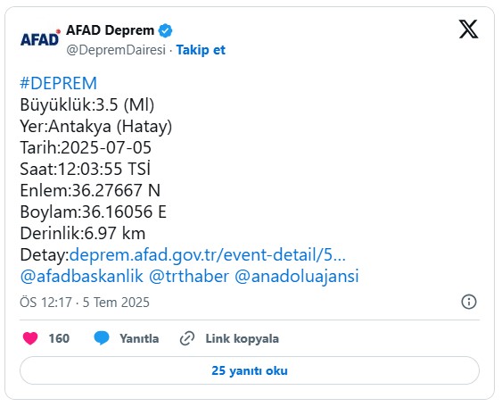 AFAD, Hatay’ın Antakya ilçesinde saat 12.03’te 3.5 büyüklüğünde deprem meydana geldiğini duyurdu.