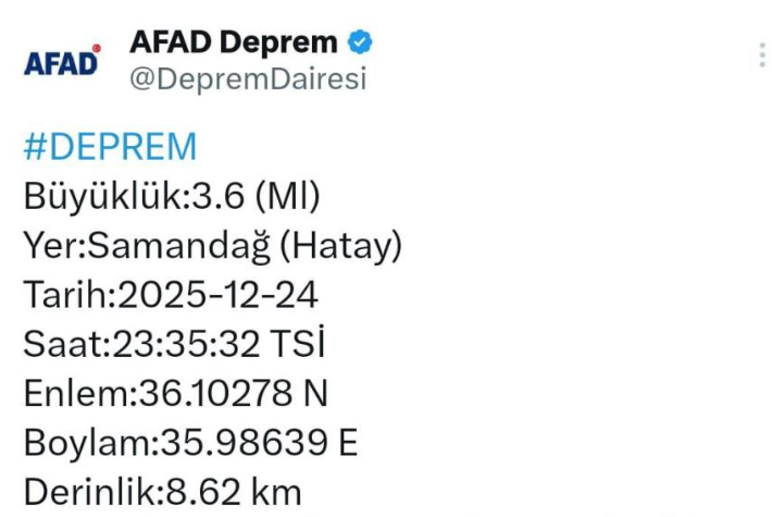 AFAD'dan alınan bilgiye göre, saat 23.35'te merkez üssü Hatay'ın Samandağ ilçesi olan 3,6 büyüklüğünde bir deprem kaydedildi.