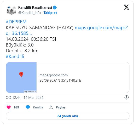 Hatay'ın Samandağ ilçesinde 3.0 büyüklüğünde korkutan bir deprem meydana geldi. Depremi Kandilli Rasathanesi sosyal medya hesabından paylaştı.