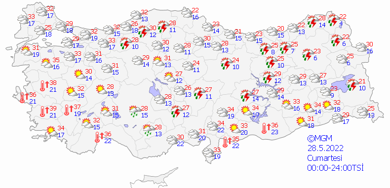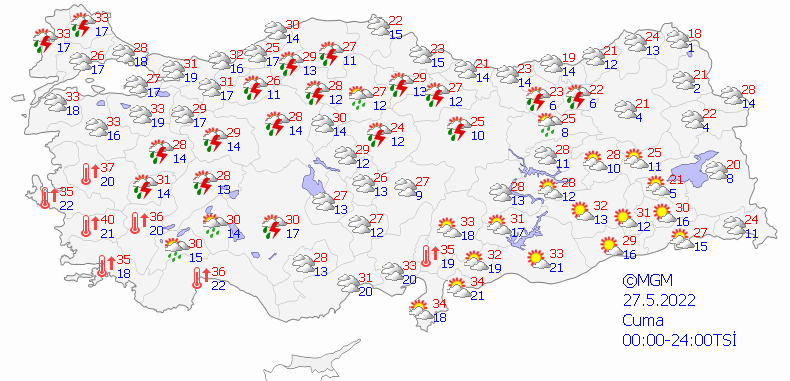 Meteoroloji Genel Müdürlüğü tarafından yapılan son değerlendirmelere göre: Yurdun batı kesimlerinin parçalı bulutlu, İç Ege, Batı Akdeniz'in iç kesimleri, Edirne ve Kırklareli çevreleri ile İstanbul'un Avrupa Yakası, Tekirdağ'ın kuzeyi, Balıkesir'in doğusu ve Bursa'nın güney kesimlerinin yerel olmak üzere sağanak ve gök gürültülü sağanak yağışlı, diğer yerlerin az bulutlu ve açık geçeceği tahmin ediliyor. Güneydoğu Anadolu'nun doğusu ile Doğu Anadolu'nun güneydoğusunda toz taşınımı bekleniyor.