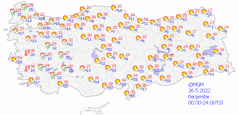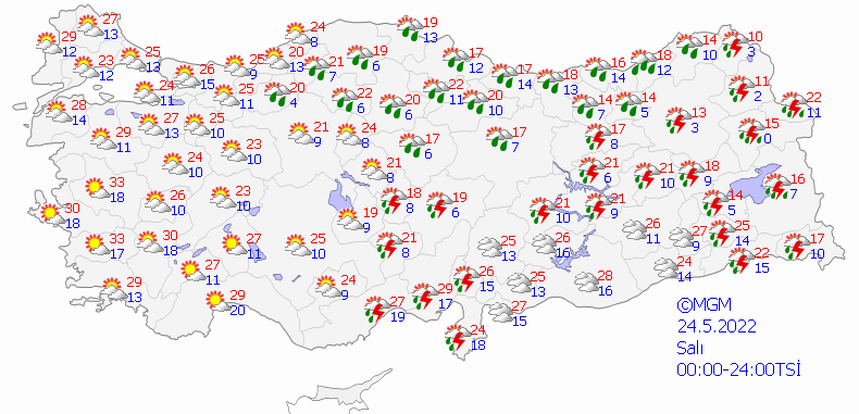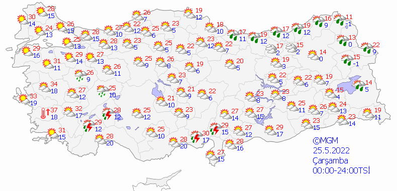 Meteoroloji Genel Müdürlüğü tarafından yapılan son değerlendirmelere göre: Ülkemiz genelinin parçalı ve yer yer çok bulutlu, Marmara'nın doğusu, İç Ege, Göller yöresi, Doğu Akdeniz, İç Anadolu, Karadeniz, Doğu Anadolu, Güneydoğu Anadolu'nun kuzeyi ile Kırklareli'nin kıyı kesimlerinin yerel olmak üzere aralıklı sağanak ve gök gürültülü sağanak yağışlı geçeceği tahmin ediliyor. Yağışların; Düzce, Bolu, Karabük çevreleri, Kocaeli ve Sakarya'nın iç kesimleri, Osmaniye çevreleri, Adana'nın doğu, Kahramanmaraş'ın batı ilçeleri ve Hatay'ın kuzey kıyılarında yerel olarak kuvvetli olması bekleniyor.