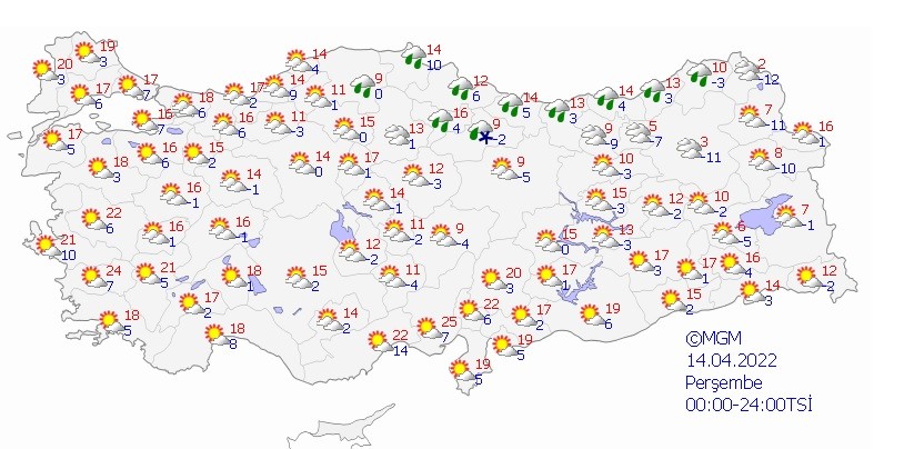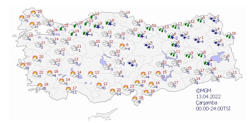 Meteoroloji Genel Müdürlüğü tarafından yapılan son değerlendirmelere göre: Ülkemizin kuzey iç ve doğu kesimlerinin parçalı, yer yer çok bulutlu, Marmara'nın doğusu, İç Anadolu'nun kuzey ve doğusu, Karadeniz, Doğu Anadolu'nun kuzey ve batısı ile Kahramanmaraş, Osmaniye, Muş, Bitlis, Kilis, Gaziantep, Adıyaman, Siirt, Batman ve Diyarbakır çevrelerinin yağışlı geçeceği tahmin ediliyor. Doğu Karadeniz ile Sivas, Yozgat, Ordu, Tokat, Erzincan, Erzurum, Tunceli, Bingöl, Muş ve Ağrı çevrelerinde yerel olarak kuvvetli olacağı tahmin edilen yağışların, genellikle yağmur ve sağanak, Karadeniz'in iç kesimleri, İç Anadolu'nun doğusu ile Doğu Anadolu'nun kuzeyinde karla karışık yağmur ve kar şeklinde olması bekleniyor. Karadeniz'in iç ve yüksek kesimleri ile Doğu Anadolu'da yüksek kar örtüsüne sahip eğimli bölgelerde çığ riski bulunmaktadır. İç ve doğu kesimlerde sabah ve gece saatlerinde buzlanma ve don olayı bekleniyor.
