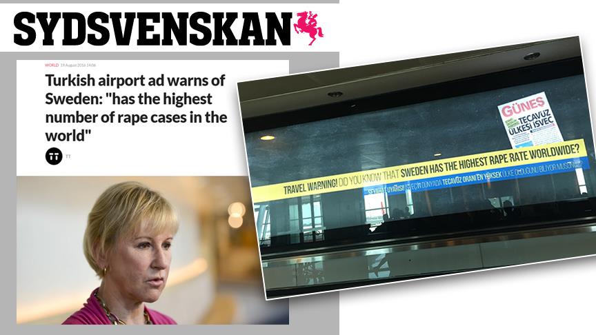Atatürk Havalimanı'nda iki reklam panosunda yer alan "Seyahat uyarısı! İsveç'in dünyada tecavüz oranı en yüksek ülke olduğunu biliyor musunuz?" şeklindeki ilan İsveç'te büyük ses getirdi.