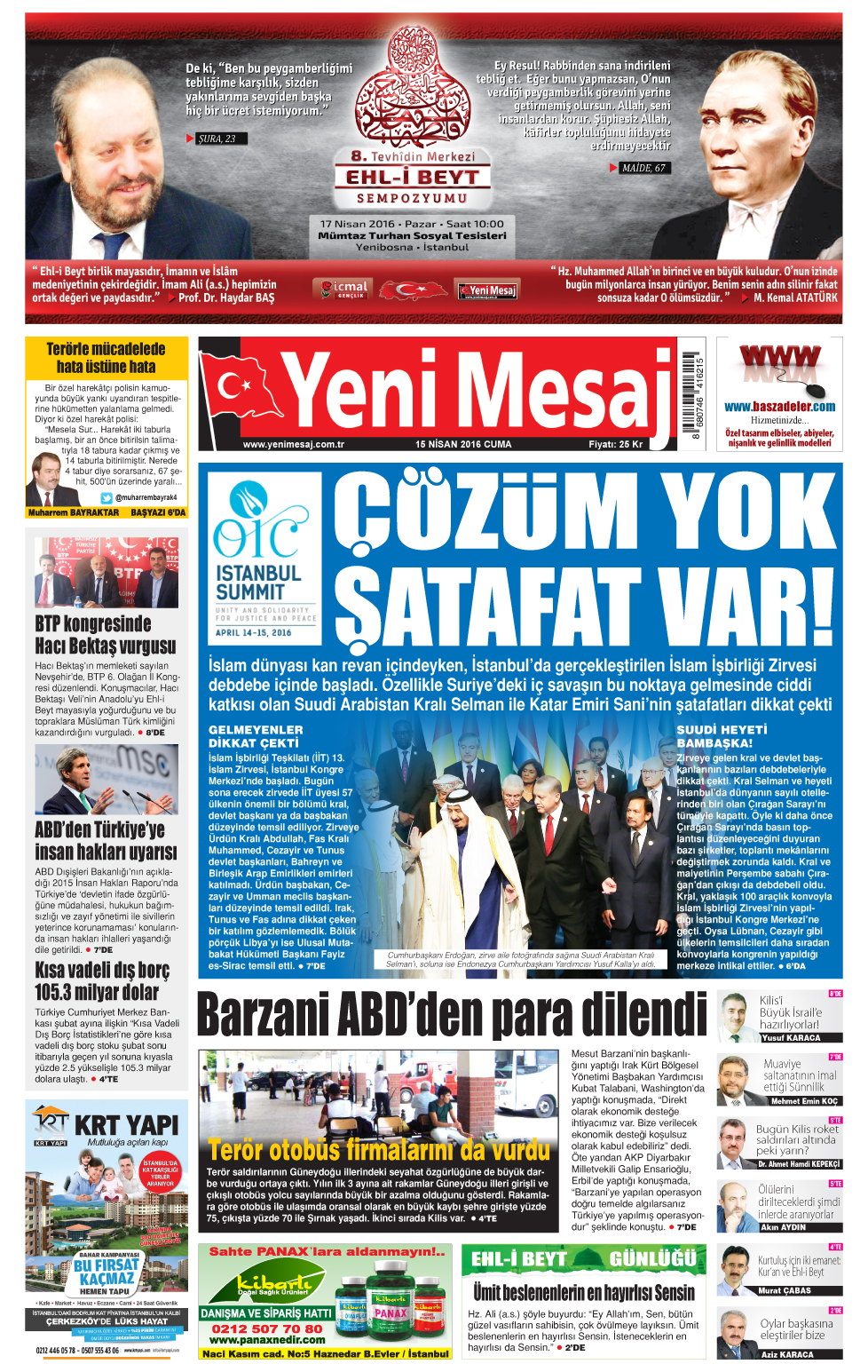 Yeni Mesaj isimli gazete bugün çok farklı bir ilk sayfa ile çıktı. Sürmanşetindeki duyuruda Haydar Baş ile Mustafa Kemal'in fotoğraflarını yan yana koyan Yeni mesaj; üst kısımda ayetlere, alt kısımlarda ise Baş ile M.Kemal'in bazı sözlerine yer verdi.