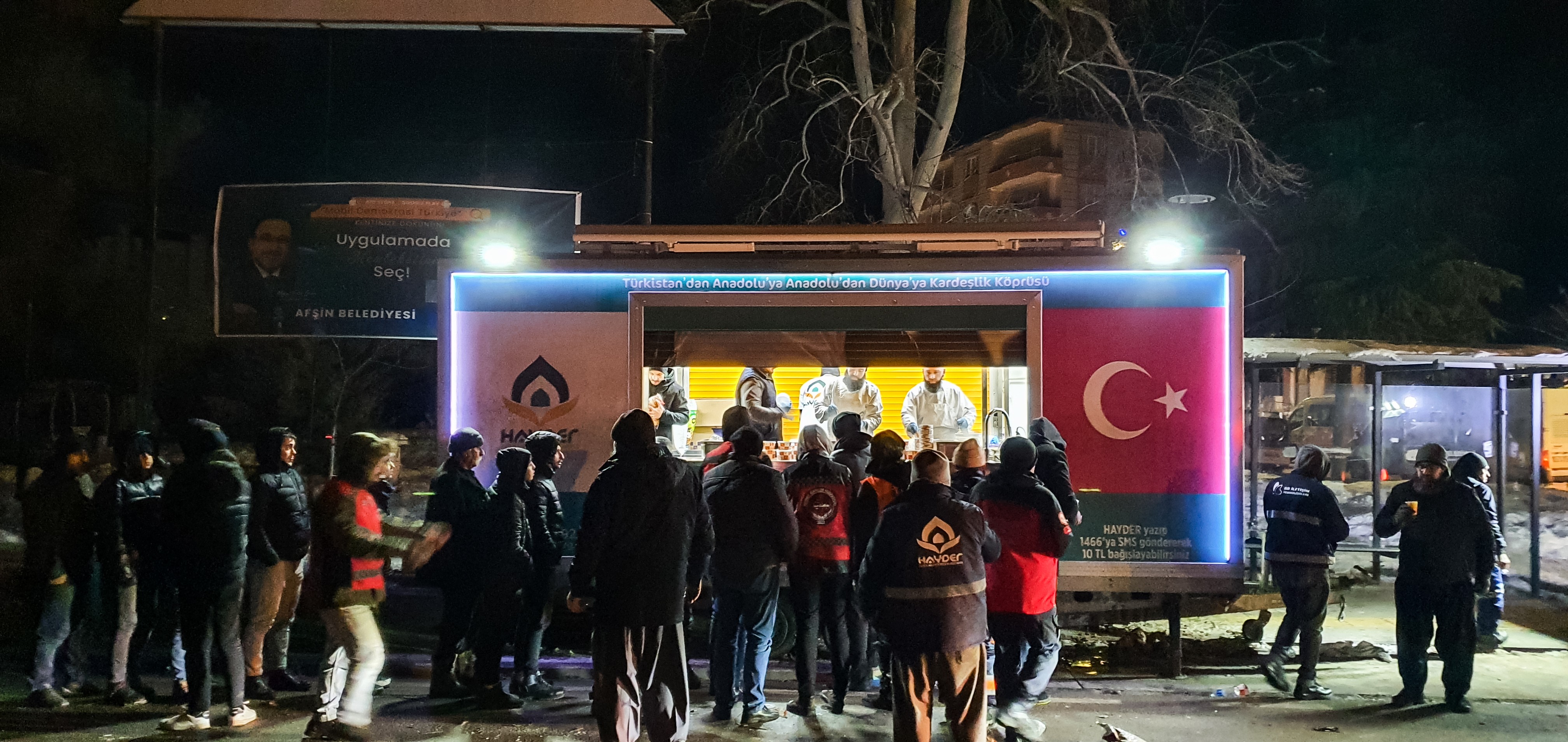 2.000 kişilik yemek üretim kapasitesine sahip Yesevi Mobil Aşevi depremden saatler sonra, AFAD’ın yönlendirmeleri doğrultusunda Kahramanmaraş Afşin’e konumlandırıldı. Binlerce depremzede vatandaşa sıcak yemek üretimi yapan HAYDER, güvenlik güçlerine, arama kurtarma ekiplerine ve sağlık görevlilerine de çay, sıcak çorba ve sıcak yemek dağıtımı gerçekleştirdi.