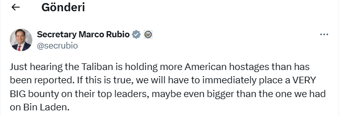 Rubio sosyal medya platformu X üzerinden yaptığı paylaşımda “Taliban'ın bildirilenden daha fazla Amerikalı rehine tuttuğunu duyuyorum” dedi.