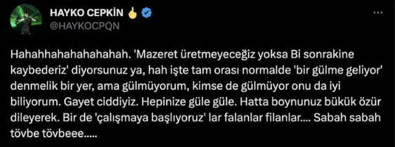 "Hahahhahahahahahah. 'Mazeret üretmeyeceğiz yoksa Bi sonrakine kaybederiz' diyorsunuz ya, hah işte tam orası normalde 'bir gülme geliyor' denmelik bir yer, ama gülmüyorum, kimse de gülmüyor onu da iyi biliyorum. Gayet ciddiyiz. Hepinize güle güle. Hatta boynunuz bükük özür dileyerek. Bir de 'çalışmaya başlıyoruz' lar falanlar filanlar.... Sabah sabah tövbe tövbeee....."