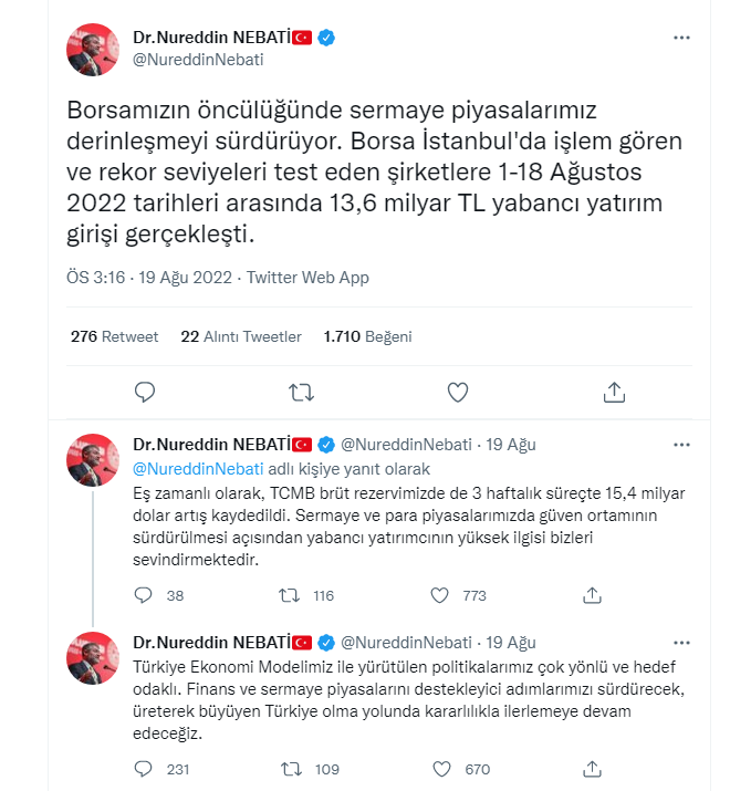 Twitter hesabından paylaşımda bulunan Bakan Nebati, Borsa İstanbul'da işlem gören şirketlere 1-18 Ağustos 2022 tarihleri arasında 13,6 milyar TL yabancı yatırım girişi gerçekleştiğini ifade etti.