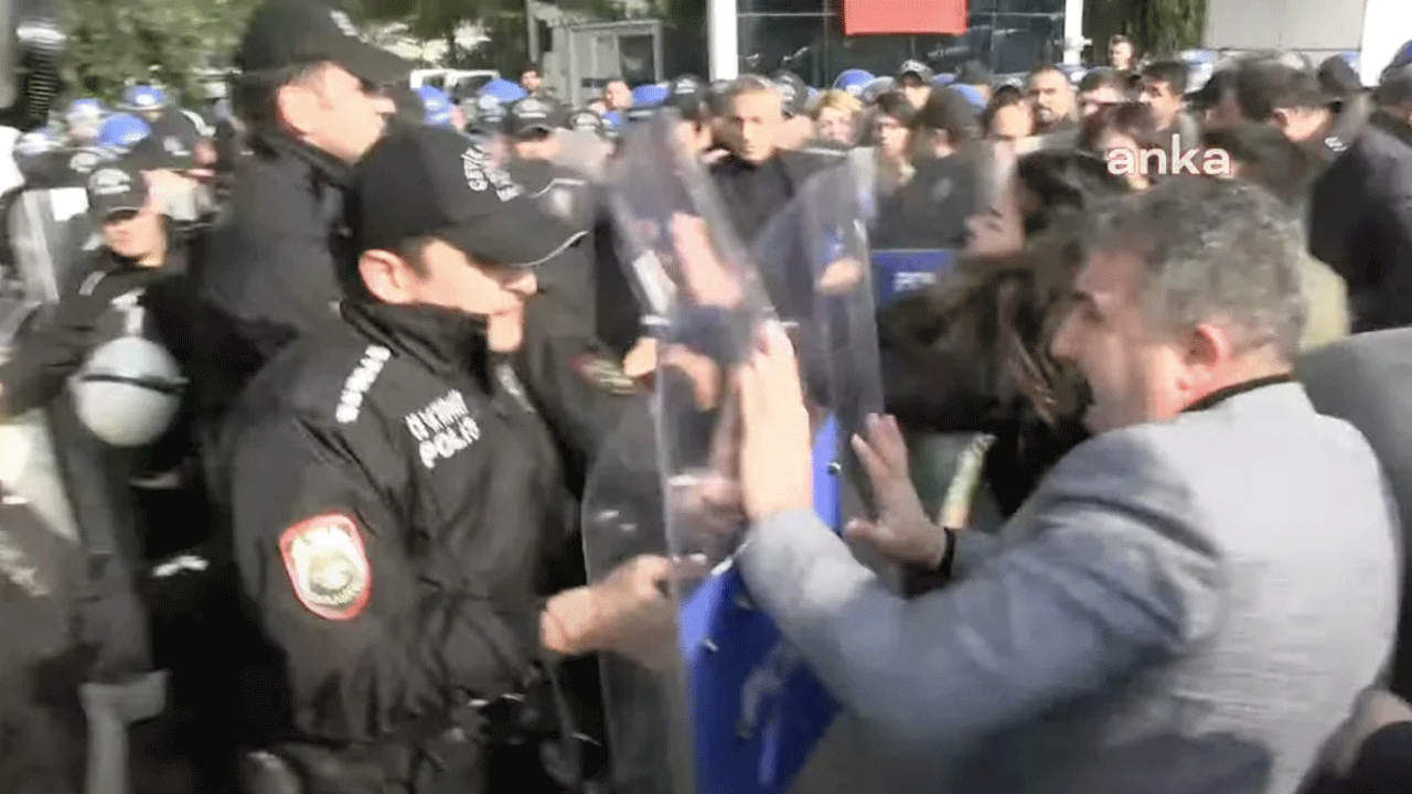 DEM Partililer, güvenlik bariyerini aşıp belediye binasına girmeye çalıştı. Kısa süre arbede yaşanan gerilimde polis, geniş güvenlik önlemleri aldı.