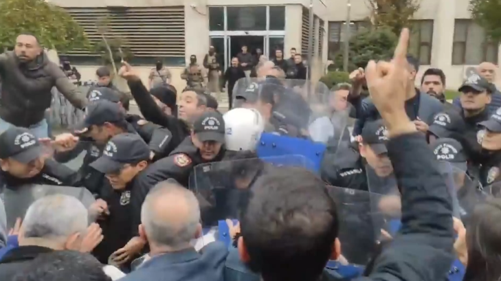 Mardin Büyükşehir Belediyesine Vali Tuncay Akkoyun'un kayyum olarak atanmasını DEM partililer hazmedemedi. Polise saldırarak belediye binasına girmeye çalıştı.