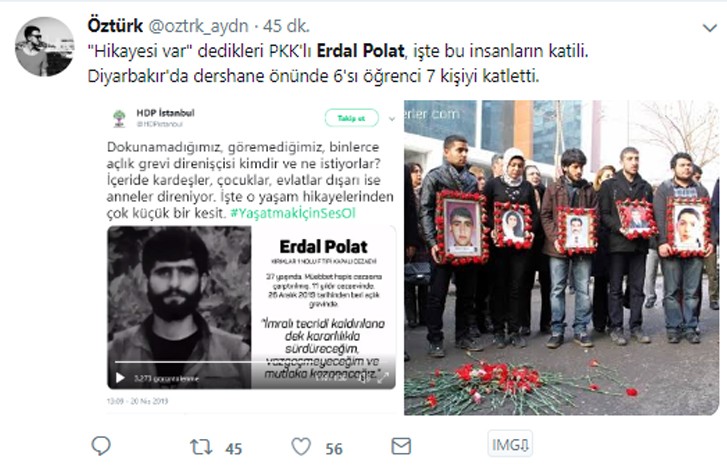 PKK'nın siyasi ayağı HDP, Diyarbakır'da 2008 tarihinde 6'sı öğrenci 7 kişinin hayatını kaybetmesine neden olan bombalı saldırıyı gerçekleştiren terörist Erdal Polat için övgü dolu sözler sarf edip, özgürlük istedi.