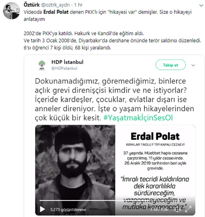 Skandal video, Twitter'da HDP'nin İstanbul sayfasında, "Dokunamadığımız, göremediğimiz, binlerce açlık grevi direnişçisi kimdir ve ne istiyorlar? İçeride kardeşler, çocuklar, evlatlar dışarı ise anneler direniyor. İşte o yaşam hikayelerinden çok küçük bir kesit. #YaşatmakİçinSesOl" notuyla paylaşıldı.