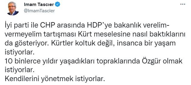 Twitter hesabından yaptığı açıklamada 'özerklik' isteyen Taşçıer, "İyi parti ile CHP arasında HDP'ye bakanlık verelim-vermeyelim tartışması Kürt meselesine nasıl baktıklarını da gösteriyor. Kürtler koltuk değil, insanca bir yaşam istiyorlar. 10 binlerce yıldır yaşadıkları topraklarında Özgür olmak istiyorlar. Kendilerini yönetmek istiyorlar." dedi.