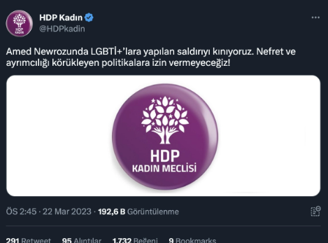 HDP Kadın Meclisi, “Amed Newrozunda LGBTİ+’lara yapılan saldırıyı kınıyoruz. Nefret ve ayrımcılığı körükleyen politikalara izin vermeyeceğiz!” diyerek eşcinsellerin safında yer aldığını belirtti.