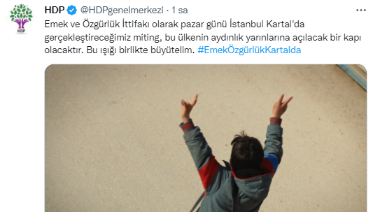 Halkların Demokratik Partisi (HDP), Türkiye İşçi Partisi (TİP), Emek Partisi (EMEP), Emekçi Hareket Partisi (EHP), Toplumsal Özgürlük Partisi (TÖP) ve Sosyalist Meclisler Federasyonu'ndan (SMF) oluşan Emek ve Özgürlük İttifakı, Pazar günü İstanbul Kartal'da büyük miting düzenleyecek.